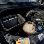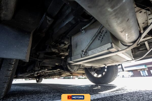 Factory equipment includes 18-inch light alloy wheels, heated and power-adjustable side mirrors, blind-spot monitoring, lane-keeping assist, Crosswind Assist technology, cruise control, and automatic climate control. Additional modifications include body-colored front and side skirts, entry steps, a Fusion head unit in the front cab, and a rearview camera.