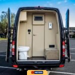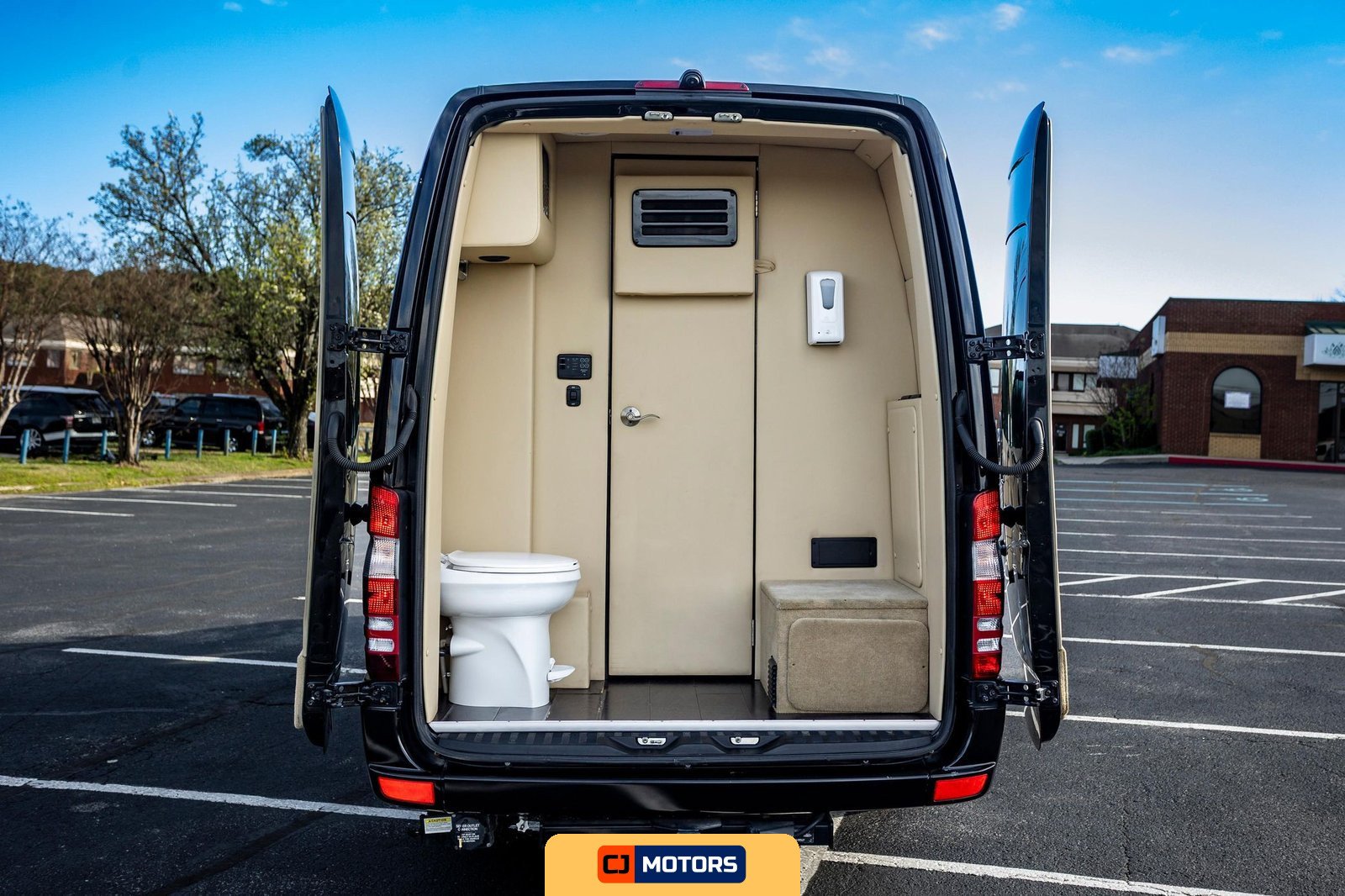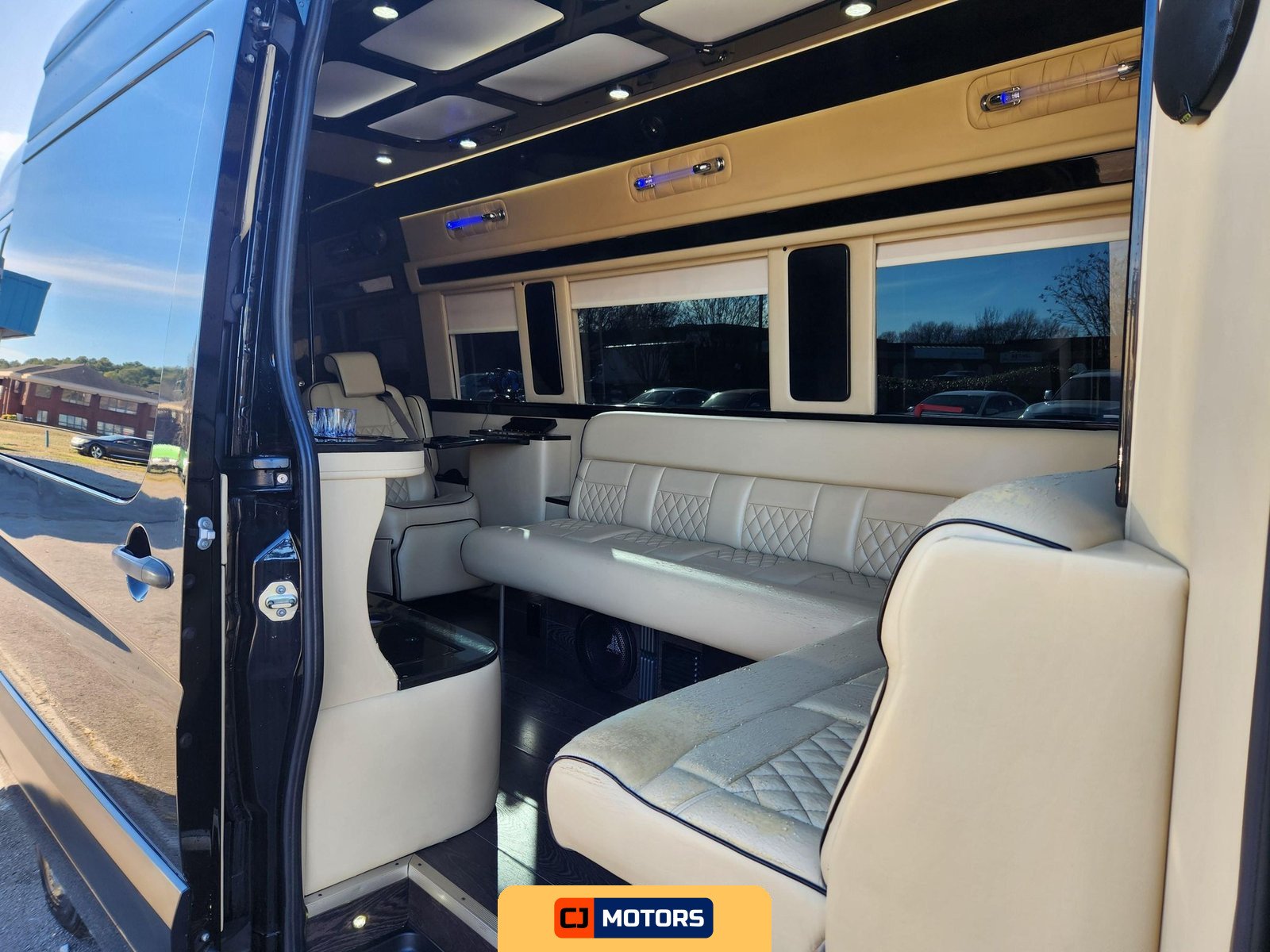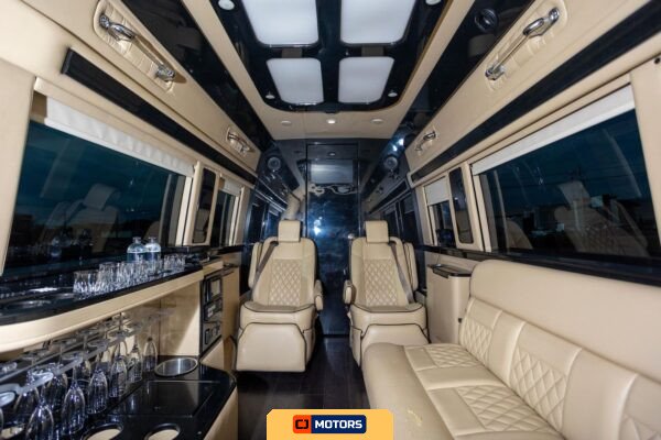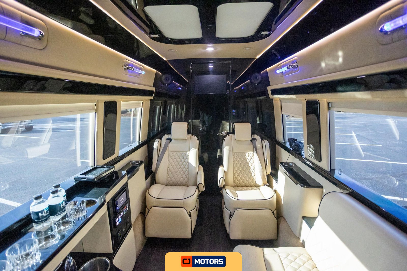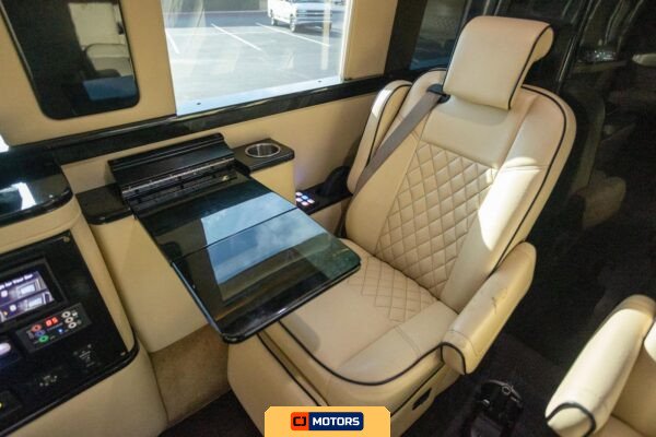 The conversion was performed by Midwest Automotive Designs and includes a comprehensive suite of amenities designed for executive transport or mobile hospitality applications. Notable features include a ProAir climate control system, Convenience Center water pump and tank heater, two captain’s chairs, rear bench seating, fold-out tables, a built-in bar with serving glasses, a JL Audio speaker system, a flatscreen television with HDMI input, and a toilet compartment with ventilation and storage.