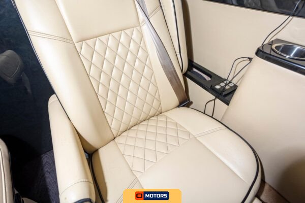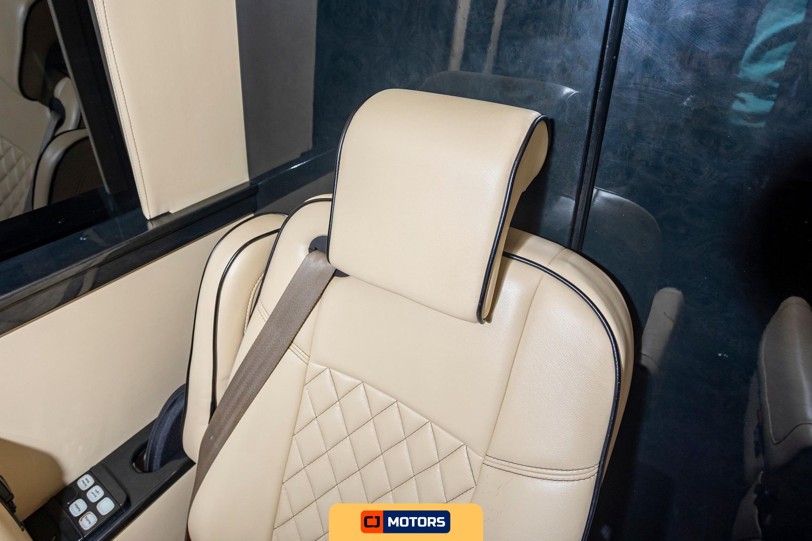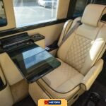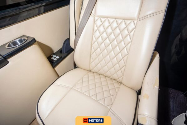 The rear limousine area is upholstered in diamond-quilted leather and configured with two captain’s chairs and a rear bench seat. The captain’s chairs are equipped with controls for the partition, lighting, and window shades. Fold-out tables are integrated into the seating arrangement. A built-in bar with serving glasses is installed, along with piano black interior trim accents. Custom interior accent lighting is controlled via dedicated panels, and custom illuminated ceiling grab handles are installed throughout the passenger compartment. Window shades provide privacy. Wireless phone chargers and plug-in fans are available for passenger use.