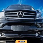 The exterior retains the Sprinter’s characteristic tall-roof profile, finished in Deep Black. Body-colored front bumper skirts and side skirts have been added, along with driver and passenger entry steps at the front and rear access points. The vehicle rides on 18-inch light alloy wheels wrapped in tires displaying 2020 date codes. A trailer hitch is mounted at the rear. Heated and power-adjustable side mirrors are equipped, along with factory blind-spot monitoring and lane-keeping assist systems. Post-repossession inspection notes document scratches, chips, and paint imperfections around the exterior, along with broken and cracked fog light housings. Scratches and blemishes are present on the wheels.